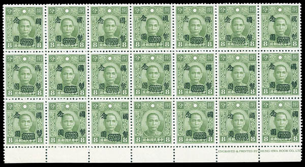 4174 ogbl image1946, Chungking Central surcharge on Dr. Sun Yat-sen, Chung Hwa printing, $20 on 8¢ olive green, surcharge missing variety (Chan 949 var. Scott 701 var.), a pristine bottom margin imprint block of 21, with position 18 the surcharge missing variety, large part o.g., Very Fine, signed S.C. Yeen in selvage below error. (Image1)