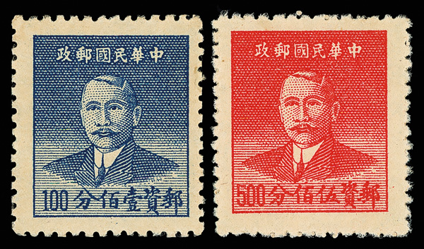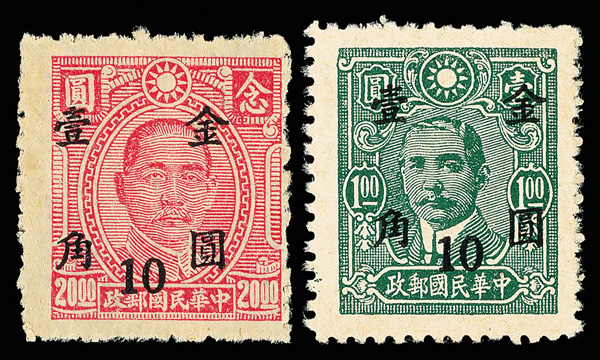 4176 ng image1948, Gold Yuan, Shanghai Union Press surcharge on Dr. Sun Yat-sen, 10¢ on $1 green & 10¢ on $20 pale rose red (Chan G39, G41. Scott 834A, 836A), each clean with clear colors and detail, plus strong surcharge, without gum as issued, Fine to Very Fine. Scott $575 (HK$ 4,420). (Image1) (Image2) (All Images)