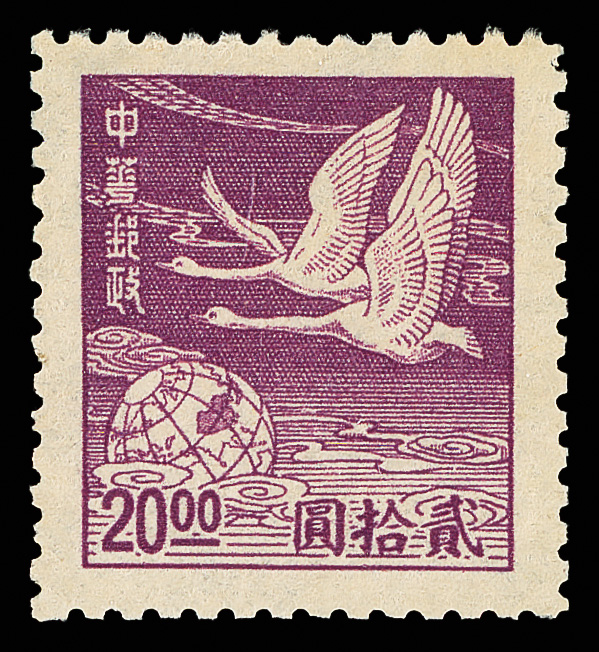 4189 ng image1949, Silver Yuan, Flying Geese, $20 violet, unissued Dah Tung Print (Chan SPN2), pristine stamp with bold color and sharp detail, sound and beautifully centered, without gum as issued, Very Fine, unpriced in Chan, rare. (Image1) (Image2) (All Images)