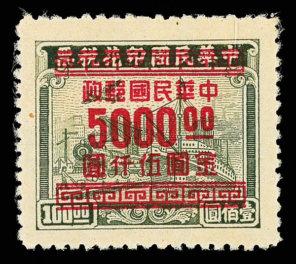 4179 ng image1949, Gold Yuan, Shanghai San Yi surcharge on Revenue, Dah Tung printing, unissued, $5,000 on $100 olive (Chan GN1. Scott 936), fresh and clean with near-perfect centering, without gum as issued, Very Fine. Scott $350 (HK$ 2,690). (Image1) (Image2) (All Images)