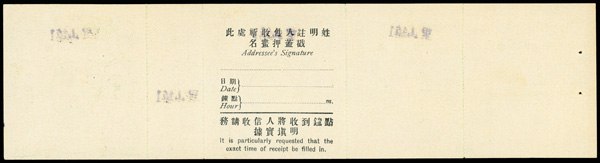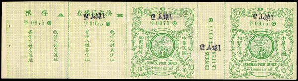 4192 ng imageExpress Letter, 1914, 10¢ green (Chan E9. Scott E10), intact and fresh, demonetized with printed letters, parts B-D with "Lishan Town 1" handstamp, without gum as issued, Very Fine. Scott $350 (HK$ 2,690). (Image1) (Image2) (All Images)