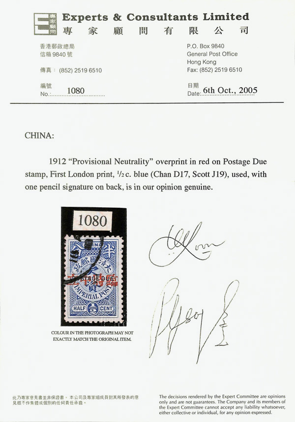 4193 O imagePostage Due, 1912, Foochow "Provisional Neutrality" overprint, ½¢ blue (Chan D17. Scott J19), crisply printed and wonderfully centered; clean overprint and unobtrusive cancel, Very Fine to Extremely Fine, signed Livingston, with 2005 Experts & Consultants Ltd. certificate. Scott $825 (HK$ 6,350). (Image1) (Image2) (Image3) (All Images)