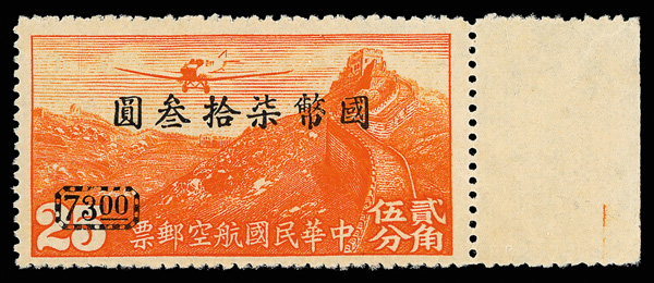 4191 og imageAirmail, 1946, C.N.C. surcharge on Peking printing, $73 on 25¢ orange yellow (Chan A47. Scott C42), right margin single, Post Office fresh with vibrant color on like-new paper, sound and alluring, o.g., barest trace of hinge (appears never hinged), Very Fine. Scott $2,500 (HK$ 19,230). (Image1) (Image2) (All Images)