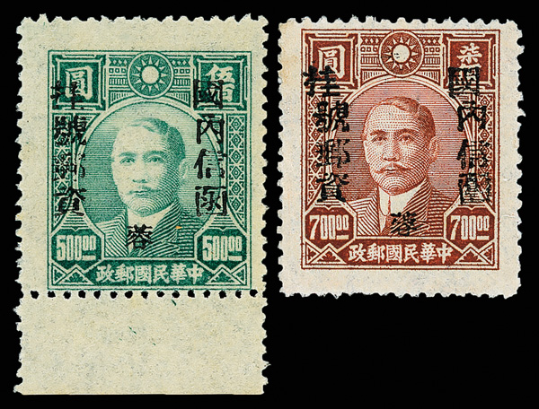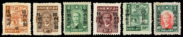 4190 ng image1949, Unit Stamps, West Szechwan "Domestic Registered" overprints, $100-$5,000 complete (Chan SR1-SR8. Scott F1-F8), fresh, without gum as issued, Fine to Very Fine, a scarce set. Scott $1,010 (HK$ 7,770). (Image1) (Image2) (Image3) (Image4) (All Images)