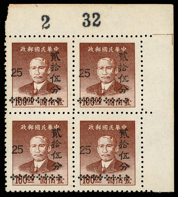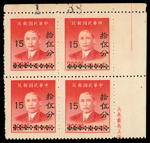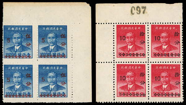 4186 ngbl image1949, Silver Yuan, East Szechwan surcharges on Dr. Sun Yat-sen complete (Chan S34-S43. Scott 997-1006), fresh, well centered blocks of four, with most values being an upper right corner margin block with sheet number, without gum as issued, Very Fine. Scott $377 as singles (HK$ 2,900). (Image1) (Image2) (Image3) (Image4) (Image5) (Image6) (Image7) (Image8) (Image9) (Image10) (Image11) (Image12) (All Images)