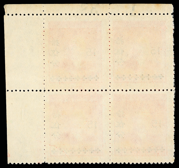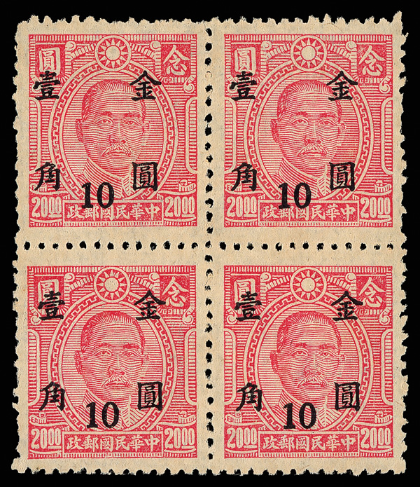 4177 ngbl image1948, Gold Yuan, Shanghai Union Press surcharge on Dr. Sun Yat-sen, 10¢ on $20 pale rose red (Chan G41. Scott 836A), block of 4, fresh and very well centered, without gum as issued, Very Fine, a lovely and rare multiple. Scott $1,200 as singles (HK$ 9,230). (Image1) (Image2) (All Images)