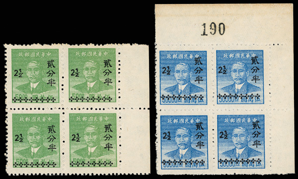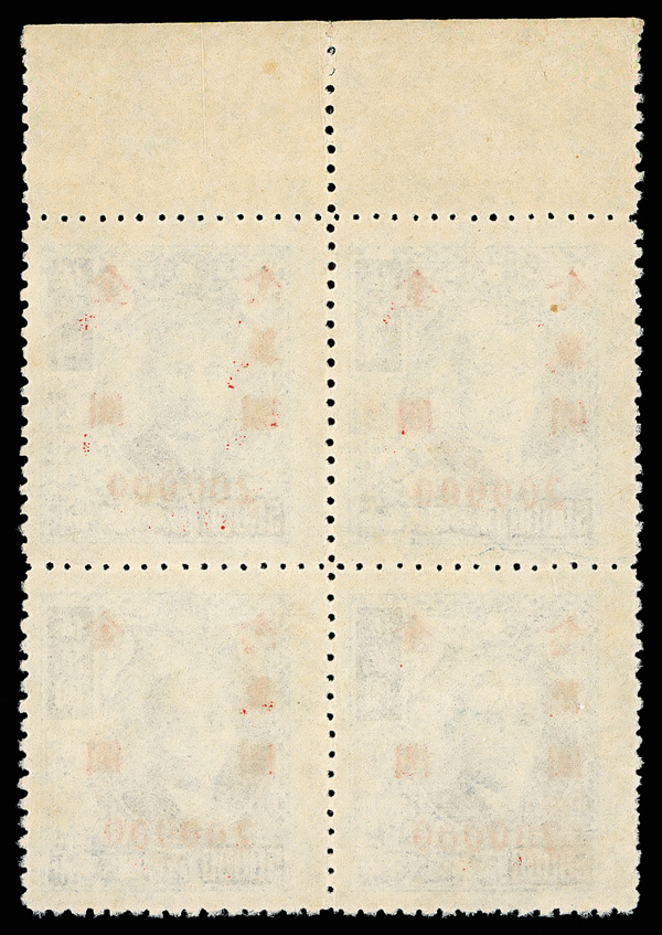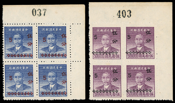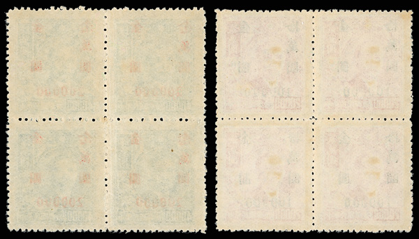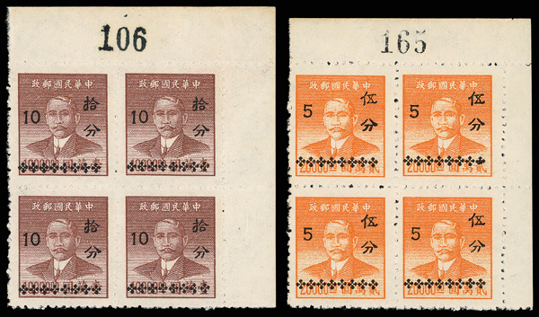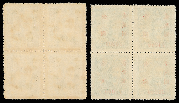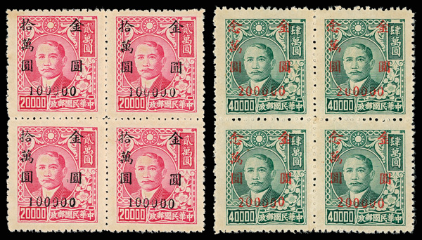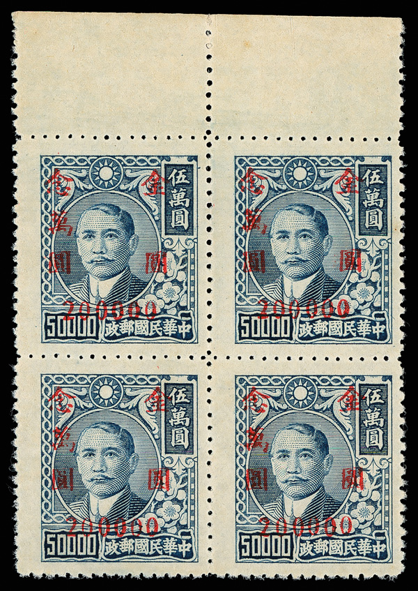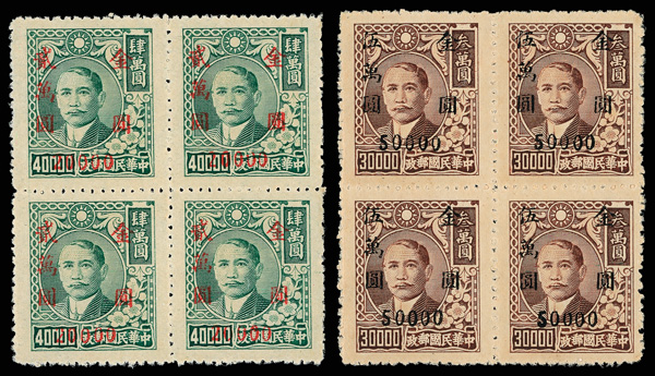 4178 ngbl image1949, Gold Yuan, Foochow surcharges on Sun Yat-sen, $20,000 on $40,000 to $200,000 on $50,000 complete (Chan G71-G75. Scott 885A-885E), blocks of 4, fresh and sound, without gum as issued, Very Fine. Scott $640 as singles (HK$ 4,920). (Image1) (Image2) (Image3) (Image4) (Image5) (Image6) (All Images)