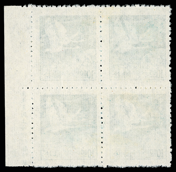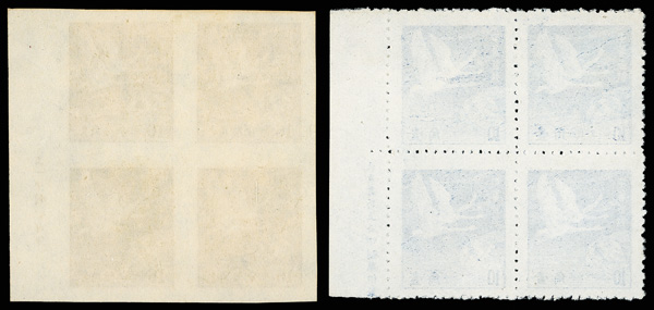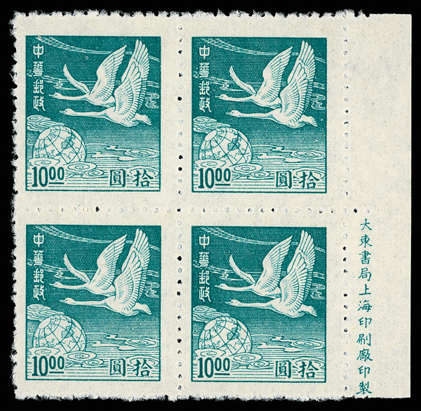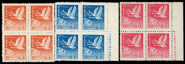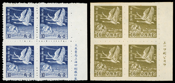 4182 ngbl image1949, Silver Yuan, Flying Geese, $1-$10 complete (Chan S18-S21. Scott 984-987), fresh blocks of four with all but the $1 marginal with imprint; also includes the unissued 10¢ blue and 16¢ olive imperforate, without gum as issued, Very Fine. Scott $960 for 984-87 (HK$ 7,380). (Image1) (Image2) (Image3) (Image4) (Image5) (Image6) (All Images)