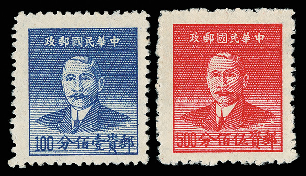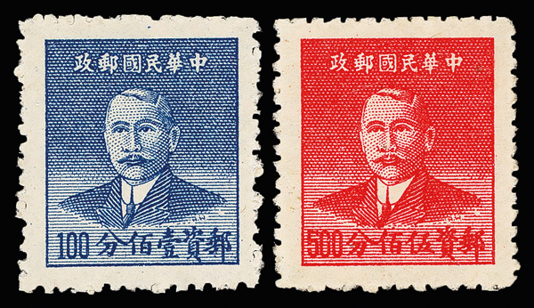 4175 ng image1948, Gold Yuan, Shanghai Union Press surcharge on Dr. Sun Yat-sen, 10¢ on $1 green & 10¢ on $20 pale rose red (Chan G39, G41. Scott 834A, 836A), each Post Office fresh with bright color and clear surcharge, without gum as issued, Fine to Very Fine. Scott $575 (HK$ 4,420). (Image1) (Image2) (All Images)