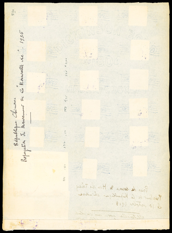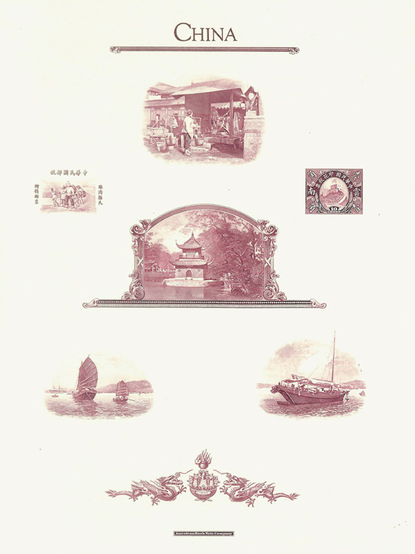 4198 og imageca. 1944, American Bank Note Company Samples Page, on cream card measuring approximately 215 x 286 mm, seven different engraved images in plum, comprising street scene, pagoda on lake, two ships, dragons and pearl, plus actual vignette for 1944 War Refugees Semi-Postals and 10c Great Wall Revenue stamp; engravings bright and crisp; page pristine, Very Fine, an attractive collateral item. (Image1)