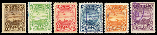 4199 og/O image1921, 1c to $10 Famine Relief Fund stamps (Chan AP53-AP59), face-fresh with bold, clean colors on pristine paper, the 1c and 10c mint, the others with a mix of cancel types, o.g., lightly hinged; $10 horizontal crease, Fine to Very Fine, a scarce group. (Image1) (Image2) (Image3) (Image4) (All Images)