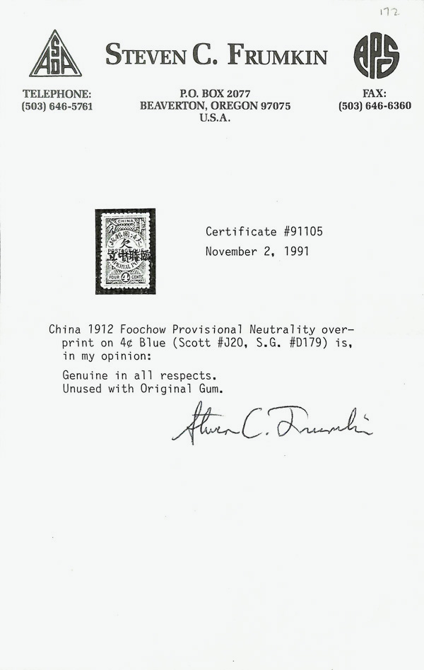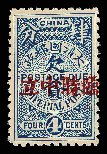 4194 og imagePostage Due, 1912, Foochow "Provisional Neutrality" overprint, 4¢ blue (Chan D18. Scott J20), Post Office fresh with sound, o.g., lightly hinged, Very Fine, with 1991 Frumkin certificate. Scott $800 (HK$ 6,150). (Image1) (Image2) (Image3) (All Images)