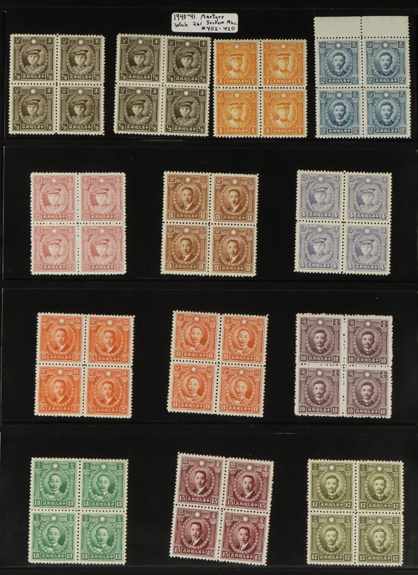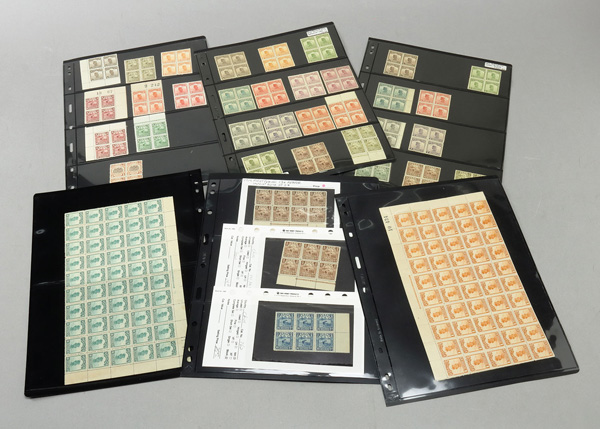 4209 imageChina, Impressive and Comprehensive Mint Collection of Blocks, 1941-49, a binder of beautifully presented stockpages, filled with blocks of four (sometimes larger), covering Martyrs, Provincial Surcharges, Martyrs, commemoratives and Airmails; some absolutely stunning examples in this collection such as #402-420, 421-439, 449-464, 465-471, 784-785, 951-958, 989-990, and more; in wonderful condition throughout, fresh with beautiful, vivid colors; an outstanding purchase for any serious collector or reseller, o.g., never hinged, Very Fine overall, fully imaged online. Shipping charges apply - weight 4.9 lbs. (Video for this lot) (Image1) (Image2) (All Images)