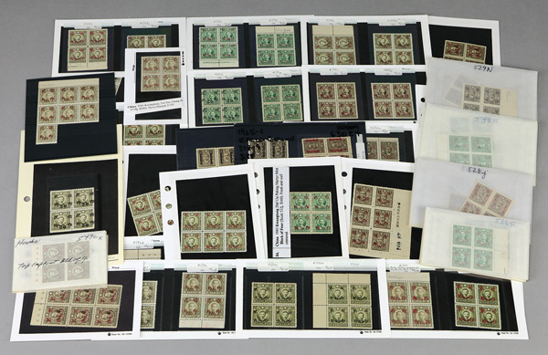 4210 imageChina, Solid Holding of Wartime Provincial Surcharges, 1942-43, fresh and sound, comprising #526-549 on 73 cards or glassines, with varying numbers of locales for each, all as blocks of four or six and most identified by Scott; many marginal blocks, some with partial or complete imprints; offered as received, thus unchecked for any specialized varieties; a boon for the serious collector or dealer, Very Fine, fully imaged online. (PDF for this Lot) (Image1) (All Images)