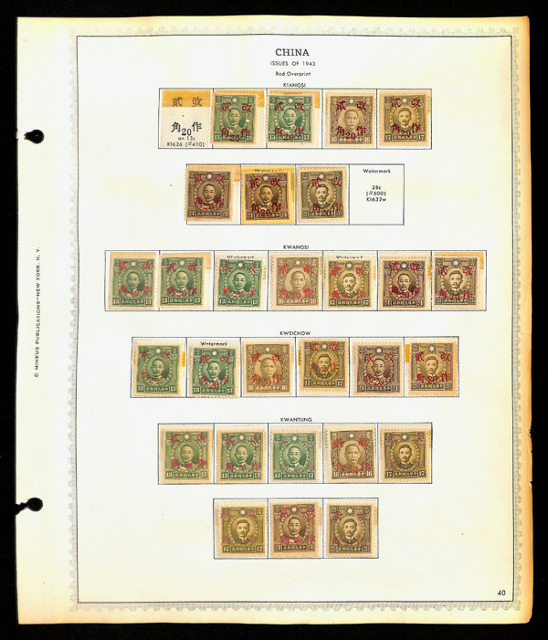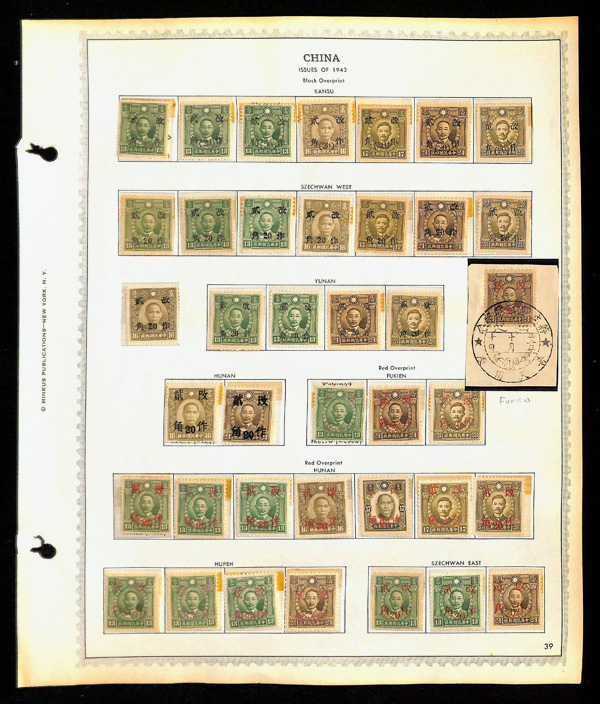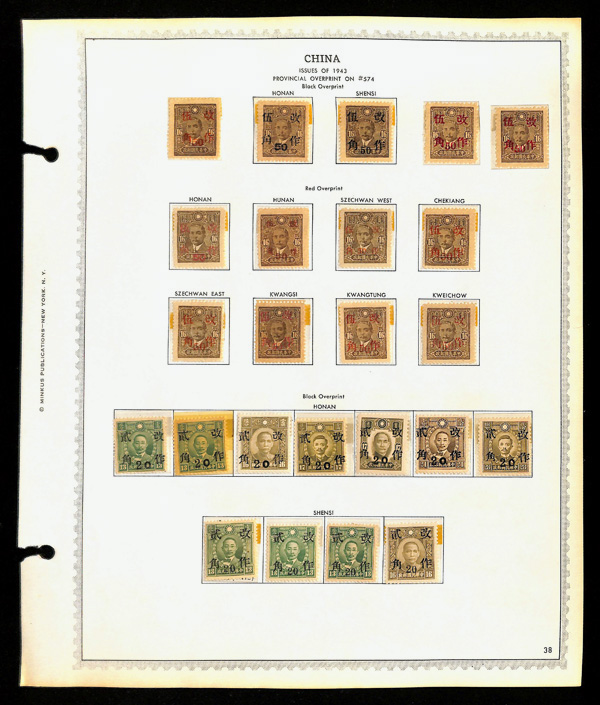 4211 imageChina, Superlative Collection of Provincial 20c & 50c Surcharges, 1943, mounted on Minkus album pages, a stellar holding spanning Scott #529//549, complete less two Kiangsi stamps; fresh mint throughout, including several perforation varieties, a "short '0'" surcharge variety, and a Fukien #546 tied on piece by commemorative cancel; an impressive compilation with better including Honan #533 and 542, Very Fine. (Image1) (Image2) (Image3) (Image4) (All Images)
