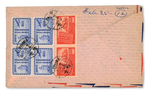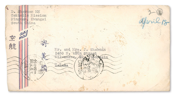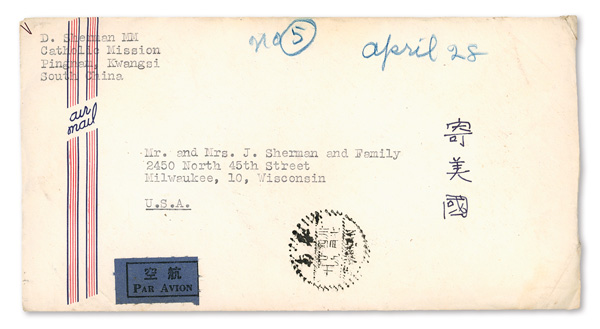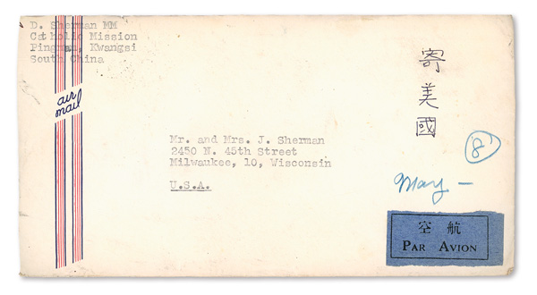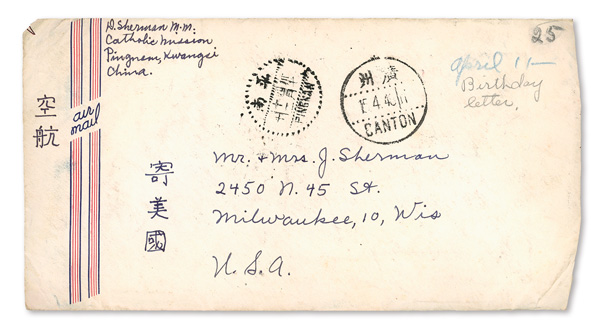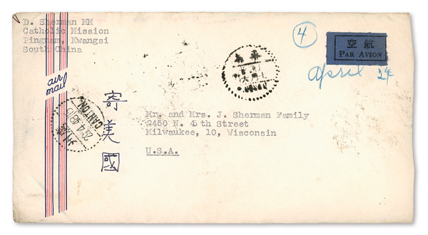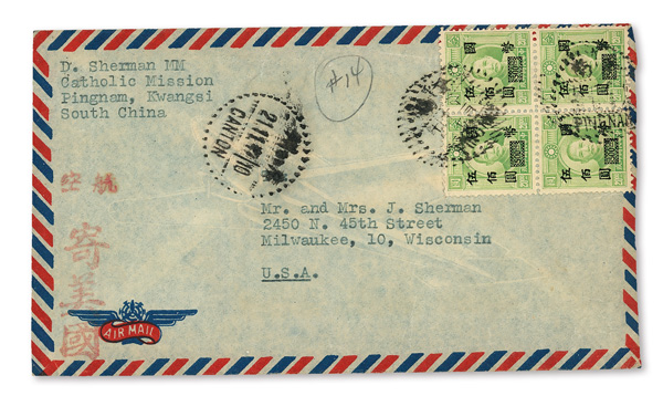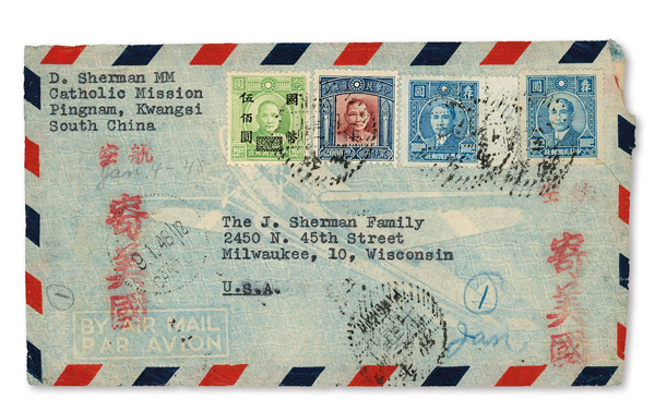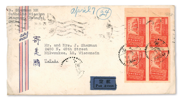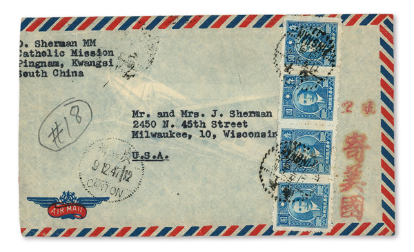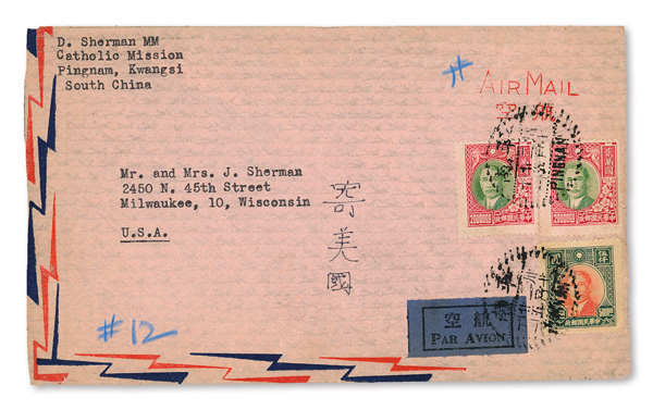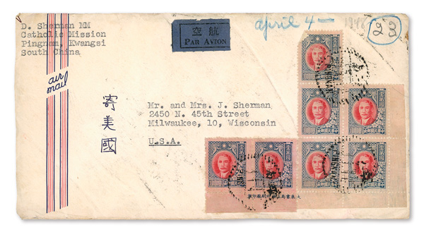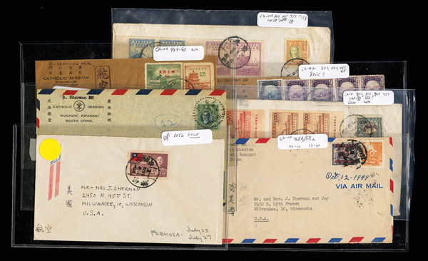 4205 cover image1947-48, Group of 12 Missionary covers from Pingnan, Kwangsi to Milwaukee, Wisconsin, all from the same correspondence from D. Sherman at the Catholic Mission in Pingnan to his parents (?) in Milwaukee; all individually sleeved and offering a wonderful variety of mixed commemorative/Sun Yat-sen frankings with singles, pairs and blocks used—including several CNCs; auxiliary markings, etiquettes and the like add to the appeal; all mailed between Nov. 1947 and Aug. 1948; a fun lot for the postal historian and rate enthusiast, Fine to Very Fine. (Image1) (Image2) (Image3) (Image4) (Image5) (Image6) (Image7) (Image8) (Image9) (Image10) (Image11) (Image12) (Image13) (Image14) (Image15) (Image16) (Image17) (Image18) (Image19) (Image20) (Image21) (Image22) (Image23) (Image24) (All Images)