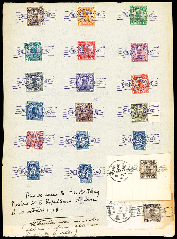 4204 Z image1918 (Oct. 10), Xu Shichuang Inauguration Special "One-Day" Cancel, sheet of bond paper bearing ½c-20c Junks plus ½c-4c Postage Dues, each tied by special cancel in used Oct. 10 only; two additional pieces, each with ½c Junk franking and cancel, one from Pagoda Anchorage, the other from Mamoi; manuscript explanation of cancels in French at bottom of page; a pretty item, Very Fine. (Image1) (Image2) (All Images)