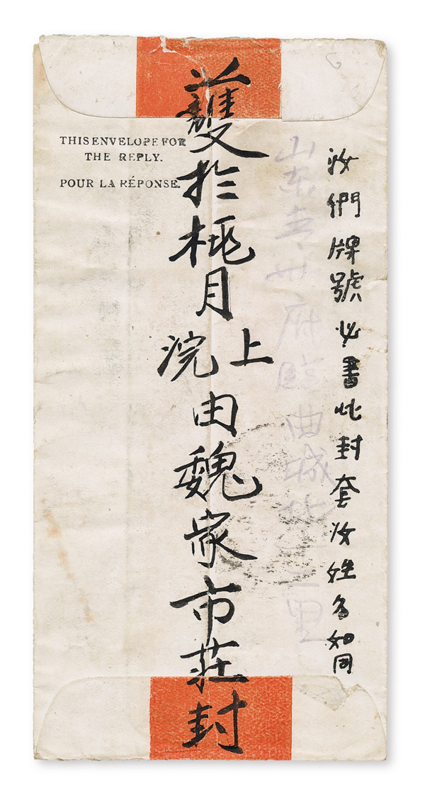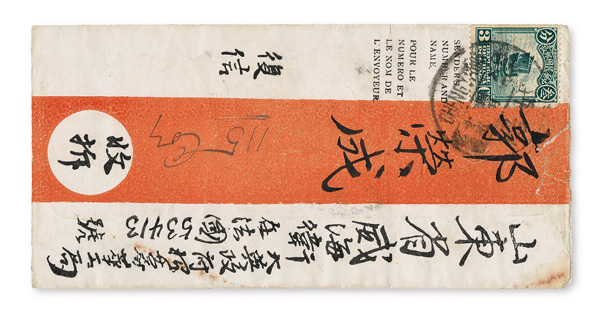 4201 cover imageca. 1913-23, Labor Corps Letter from Weihaiwei to Shandong, small red band response envelope franked by 3c Junk, tied by Chengyang Apr. 15 bilingual cancel (year illegible); slight edge toning or damage not affecting stamp, still an interesting and uncommon use, Fine to Very Fine. (Image1) (Image2) (All Images)