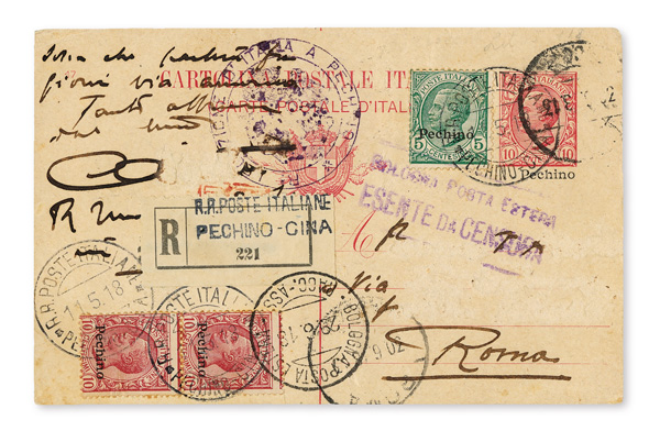 4203 O image1918 (May 11), Italian Offices in Peking, Registered postal card to Rome, 10c postal card uprated by 5c single and 10c vertical pair, the stamps tied by "Poste Italiano/11,5.18/Pechino, Cina" bridge postmarks with double-ring postmark alongside; black-on white Registry label, violet "Bologna Posta Estera/Esente da Censura" handstamp (additionally tying 5c), Bologna transit (June 29) and Rome receiver (June 30) all on front; light overall toning, slightly scuffed away from stamps, Fine to Very Fine. (Image1) (Image2) (All Images)