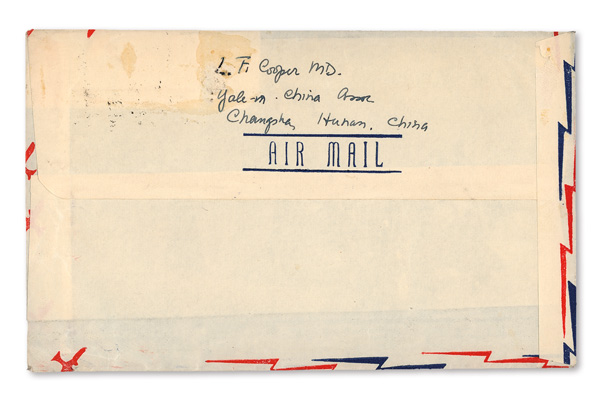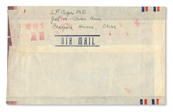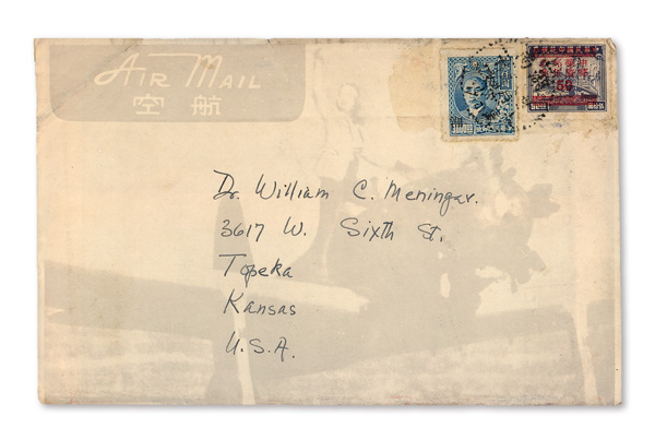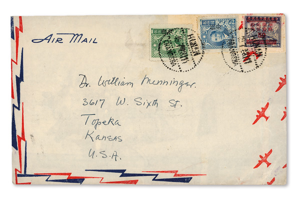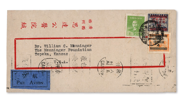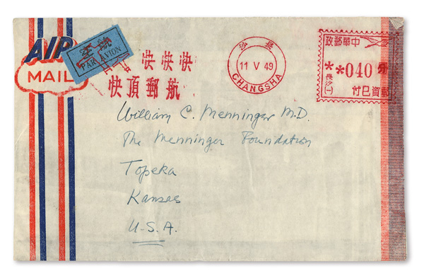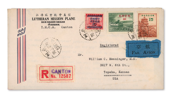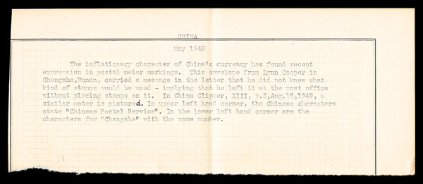 4207 cover image1949 (May 11), Meter Airmail cover from Changsha to Topeka, Kansas, remarkably fresh, clean and sound, with crystal-clear strike of "040" meter showing flying goose at upper right; the original enclosure (no longer accompanying) stated the sender, Lynn Cooper, stated that he did not know what kind of stamps would be used, suggesting he left it at the post office without placing stamps on it; a similar meter cover is illustrated in the Aug. 15, 1949 China Clipper (vol. 13, p. 3), Very Fine, a neat item. (Image1) (Image2) (Image3) (All Images)