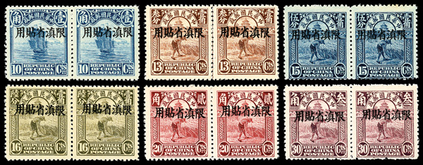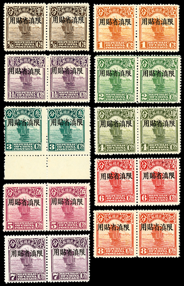 4220 nh/og image1926, "Limited for Use in Yunnan Province" on Junk Issue, 2nd Peking printing, ½¢-50¢ (Chan Y1-17. Scott 1-17), horizontal pairs, a beautiful group of multiples, Post Office fresh and bright with clean detail and color, with many never hinged, Very Fine. (Image1) (Image2) (Image3) (Image4) (Image5) (Image6) (All Images)