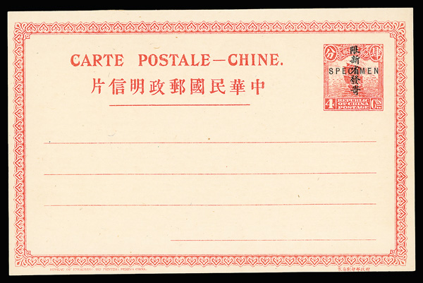 4219 S imagePostal Card, 1915, 4¢ red Junk, overprinted "SPECIMEN" (China Stamp Society PCI[SK]-1), pristine example of this bordered postal card, the Provincial overprint with first character shifted to left as issued, crossed horizontally by "SPECIMEN" overprint, with bright color, clean card stock and sound condition, Very Fine. (Image1) (Image2) (All Images)