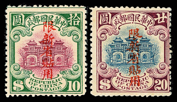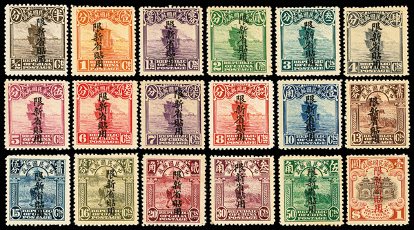 4216 og/ng image1924, "Limited for Use in Sinkiang Province" on Junk, 2nd Peking printing, ½¢ sepia-$20 blue & deep purple (Chan PS47//PS70. Scott 47-68), appealing set of overprinted Junks, fresh with bright, bold colors, the $10 and $20 fresh and sound; 15c & $1 no gum, 16c hinge thin, a few other lower values with slight gum issues, Fine to Very Fine, $20 signed Bloch. Scott $1,041 (HK$ 8,010). (Image1) (Image2) (Image3) (Image4) (Image5) (Image6) (All Images)