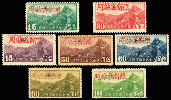 4218 og/ng imageAirmail, 1942, "Limited for Use in Sinkiang Province" on Peking printing, 15¢-$1 complete (Chan PSA5-12. Scott C5-C12), pretty set with strong colors and clean impression, the overprints particularly strong; 45c no gum, others lightly hinged o.g., Fine to Very Fine, rare 25c value signed Bloch. Scott $584 (HK$ 4,490). (Image1) (Image2) (Image3) (Image4) (All Images)