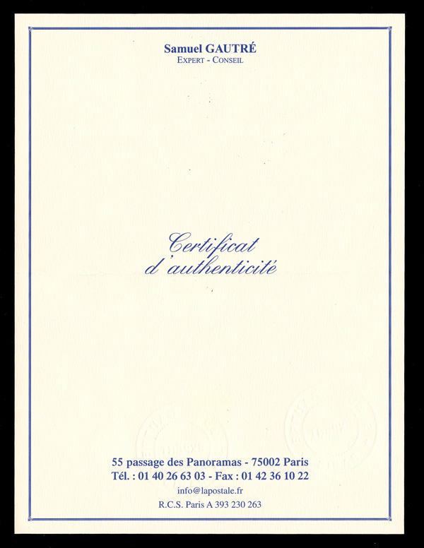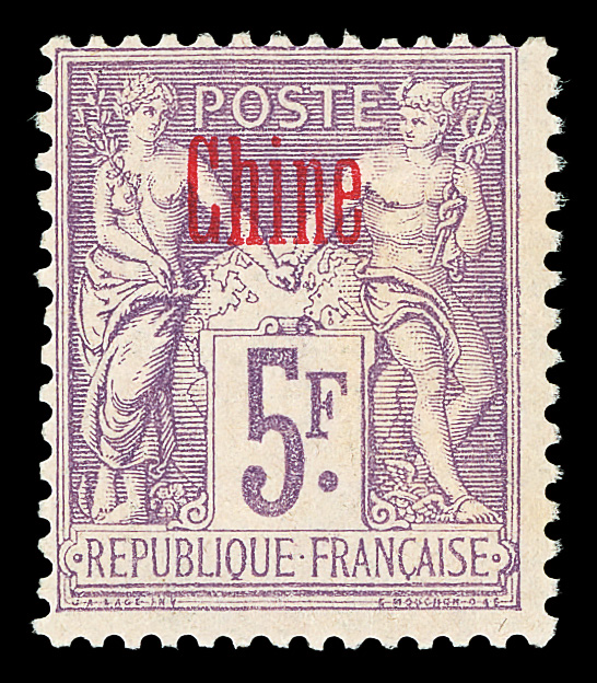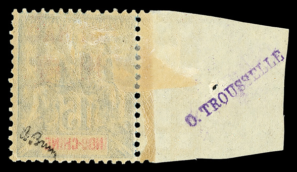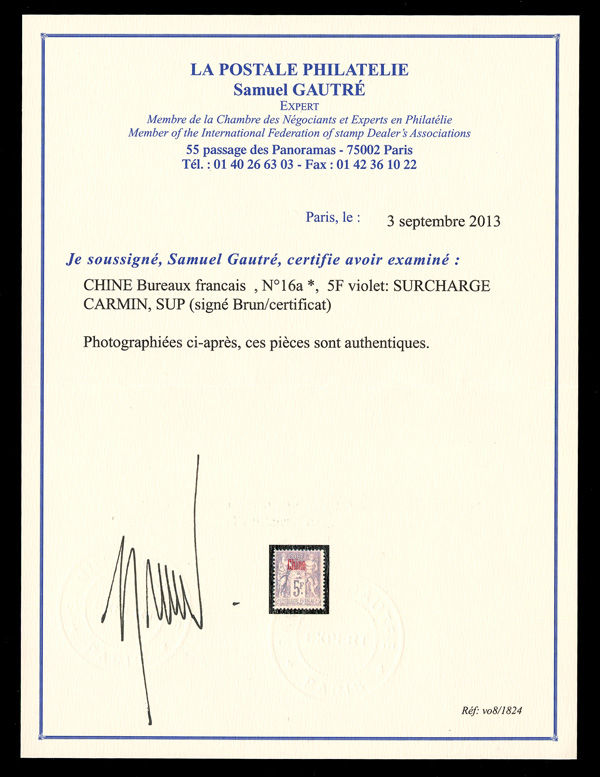 4223 og image1894, 5f red lilac, overprinted in red (Scott 12Ab. Maury 16a), Post Office fresh, o.g., very lightly hinged, Very Fine+, a beauty, signed Brun and Scheller, with 2013 Gautré certificate. (Image1) (Image2) (Image3) (Image4) (All Images)