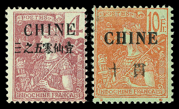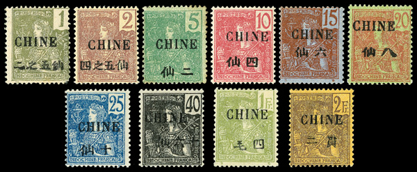 4224 og image1904-05, 1c-10f surcharges on Indochina issues complete (Scott 46-56. Maury 63-74), fresh with bold colors and clean surcharges, o.g., some hinged, Fine to Very Fine, a scarce and seldom-offered complete set, 4c and 1f signed. (Image1) (Image2) (Image3) (Image4) (All Images)