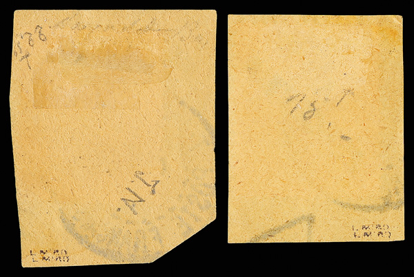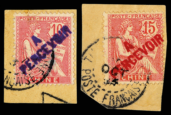 4225 Z imagePostage Due, 1903, 10c & 15c "A Percevoir" handstamps (Scott J28, J29a), each tied to piece with the 10c value showing rare purple handstamp, Fine to Very Fine, each signed Miro. (Image1) (Image2) (All Images)