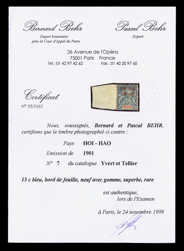 4227 nh image1901, 15c blue (Scott 6. Maury 7), a magnificent, left margin example of this great rarity, wonderfully fresh and beautifully centered, full, clean o.g. with small hinge remnant, Very Fine and choice, signed A. Brun and Trousselle, with 1998 Bernard & Pascal Behr certificate. (Image1) (Image2) (Image3) (All Images)