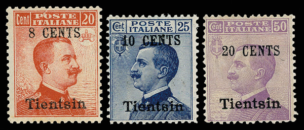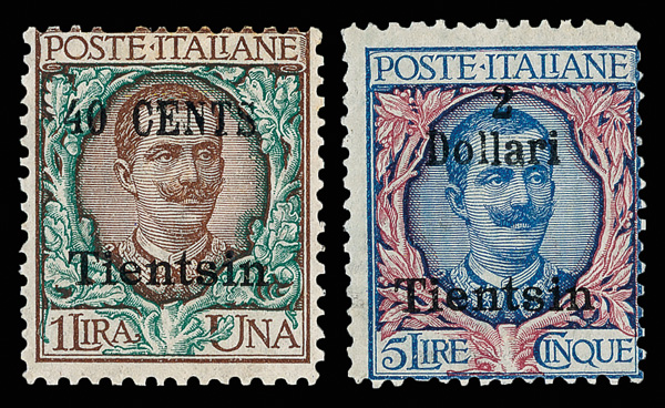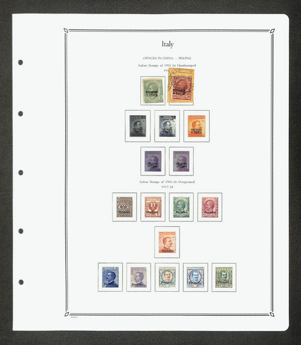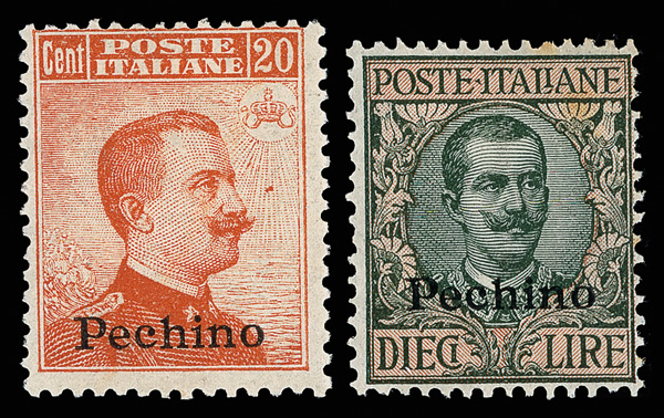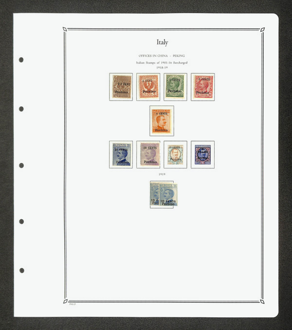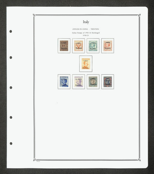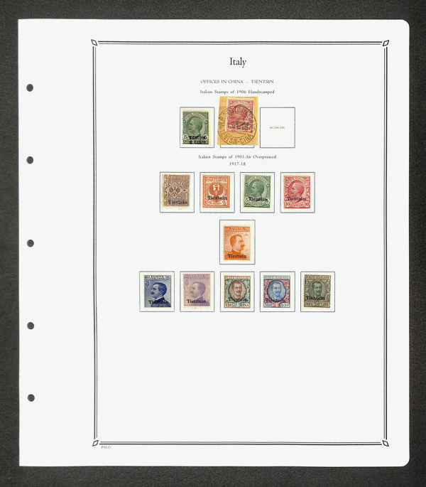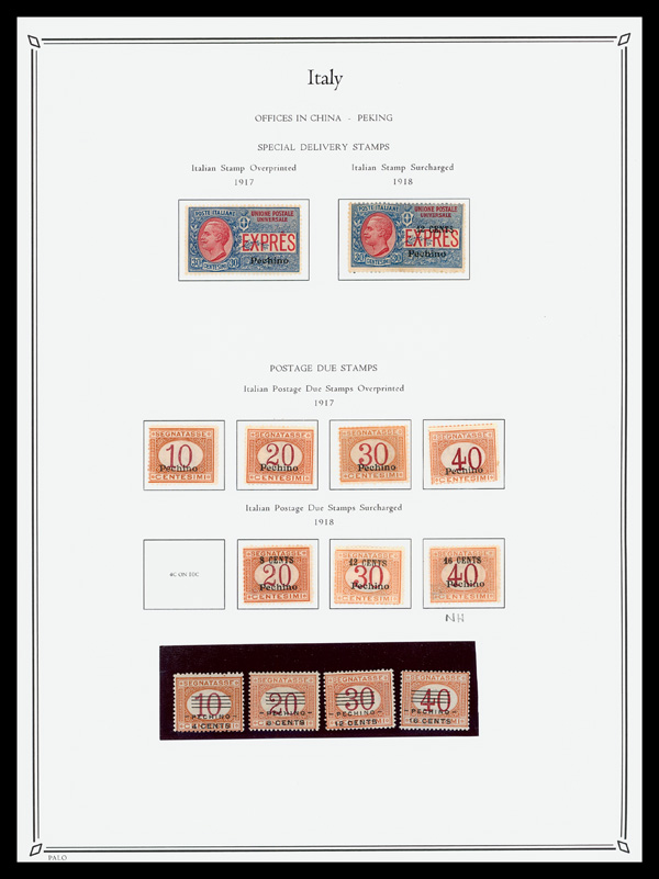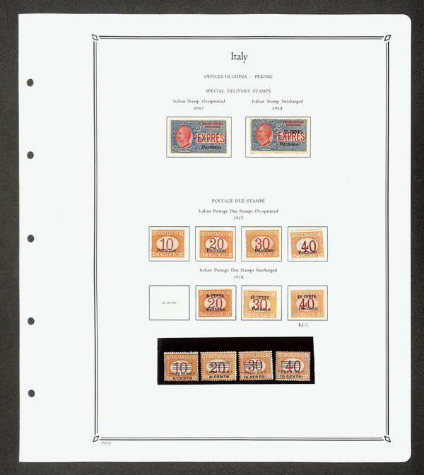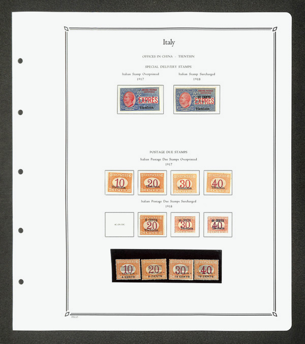 4230 imageItalian Offices in China, Fresh Mint Collection, 1917-21, on Palo hingeless album pages, all but two mint; comprises Peking #1, 2 (used on piece), 22-28, 32 (2), E1-E2, J1-J4, J6-J8, and 1919 unissued Dues complete; Tientsin #1, 2 (used on piece), 5-14, E1-E2, J1-J4, J6, and 1919 unissued Dues complete; bright and clean throughout; note that Palo albums are printed in color; all stamps actually present are listed above, Fine to Very Fine, fully imaged online. (Image1) (Image2) (Image3) (Image4) (Image5) (Image6) (Image7) (All Images)