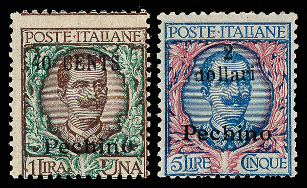 4232 og image1918-19 Victor Emmanuel III 40¢ on 1L brown & green and $2 on 5L blue & rose, type I (Scott 29-30. Sassone 26-27), pretty duo, each Post Office fresh with rich colors on bright paper, o.g., very lightly hinged, Fine to Very Fine, both signed, the $2 on 5L by Olivia & Raybaudi. (Image1) (Image2) (All Images)