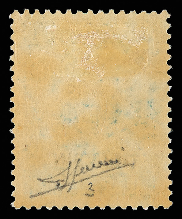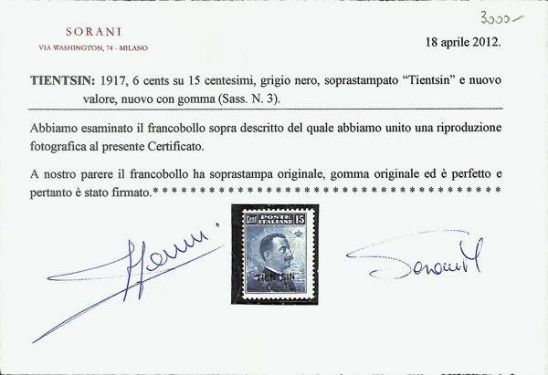 4233 og image1917 Victor Emmanuel III 6¢ on 15c slate (Scott 4. Sassone 3), fresh with sharp detail in bold color, o.g., very lightly hinged, Very Fine, signed Sorani, with his 2012 certificate. (Image1) (Image2) (Image3) (All Images)