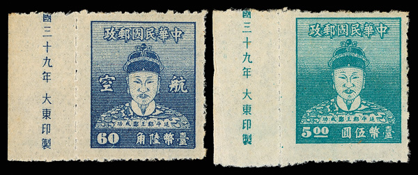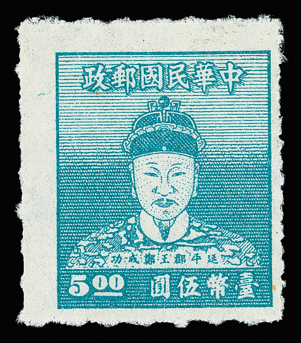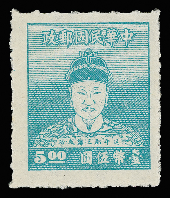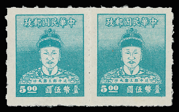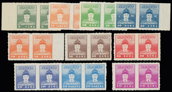 4263 ng image1950, 3¢/$5 Koxinga (Scott 1012//1024, C64), complete in horizontal pairs, missing just the 10¢ and $1.50 values, fresh and bright, without gum as issued, Very Fine. (Image1) (Image2) (Image3) (Image4) (All Images)