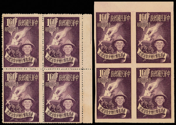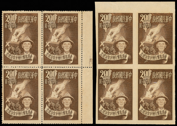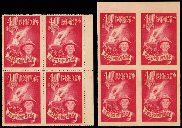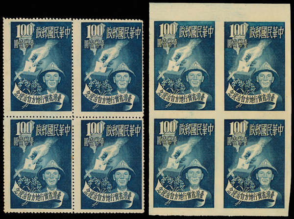 4264 ngbl image1950, surcharge on Dr. Sun Yat-sen & Plum Blossoms, 50¢ on $5,000,000 ultramarine (Scott 1036), right margin imprint block of 4, crisp color and impression, without gum as issued, Very Fine. (Image1) (Image2) (All Images)