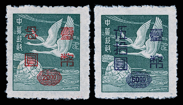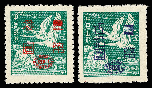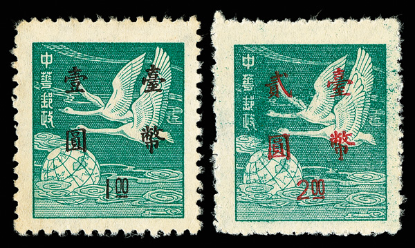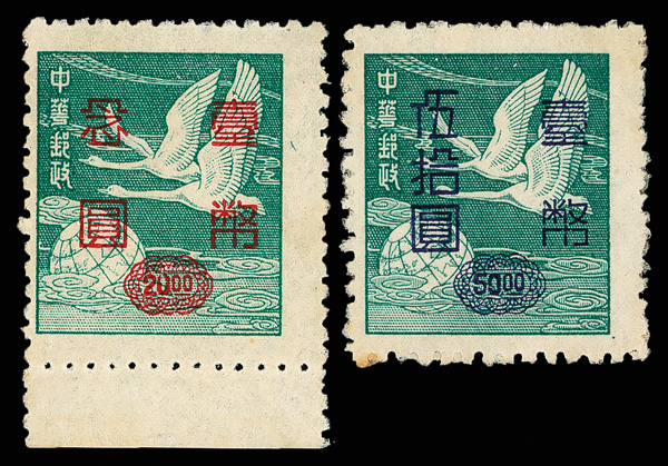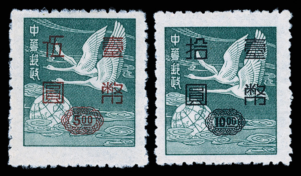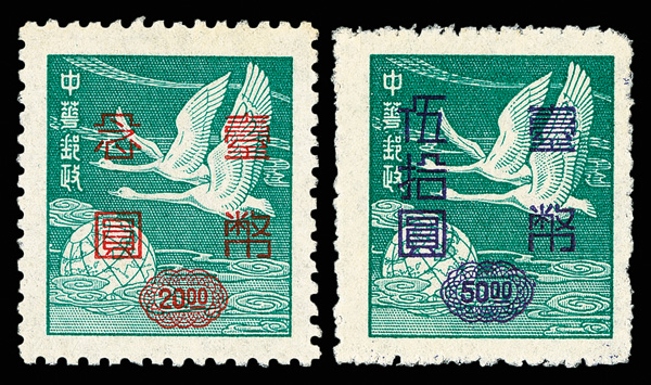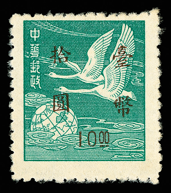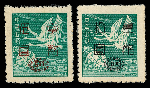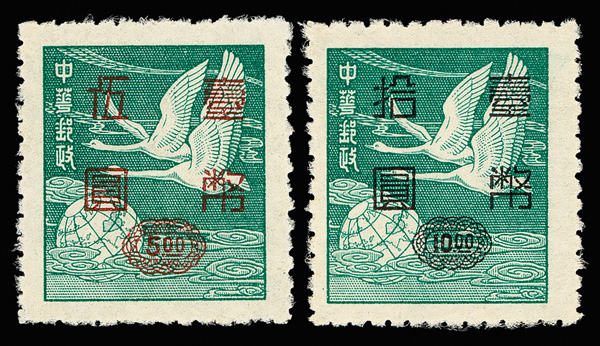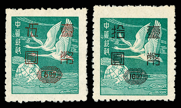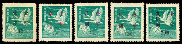 4275 ng image1952, Silver Yuan surcharges on Flying Geese, $5-$50 complete (Scott 1042-1045), exceptionally well centered set with rich colors, without gum as issued, Very Fine and choice. (Image1) (Image2) (Image3) (Image4) (All Images)