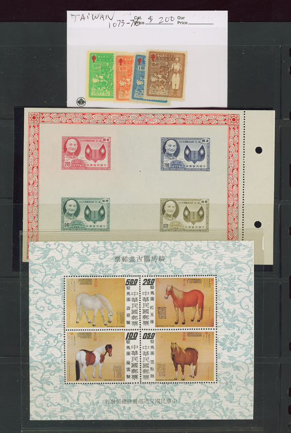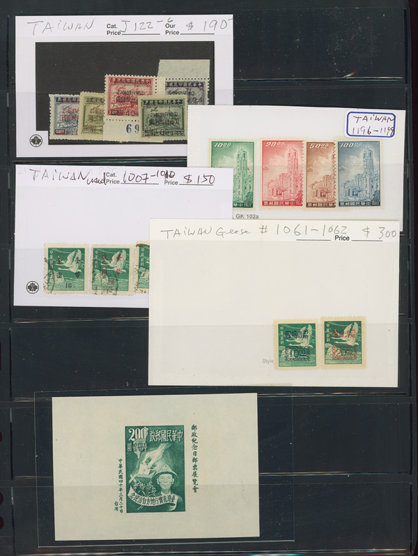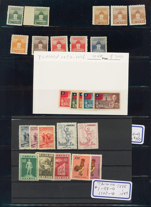 "Taiwan proper" from 1949; numerous better including (mint unless noted) Province #69-73, 101-103, J6-J9, J13-J17 and Taiwan #1007, 1008-1010 (used), 1042-1045 (used, plus 1045 block of, four used), 1037-1040 perforated and imperforate,