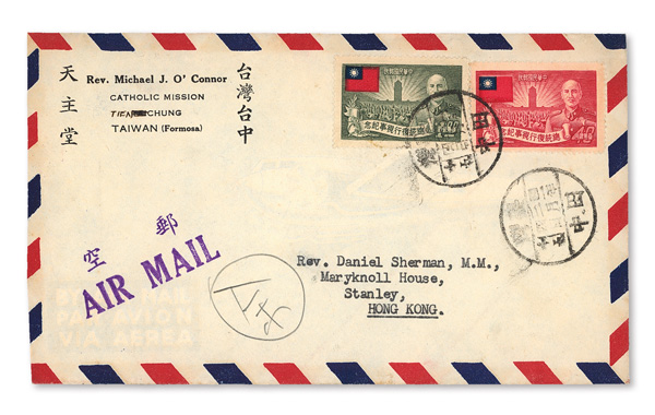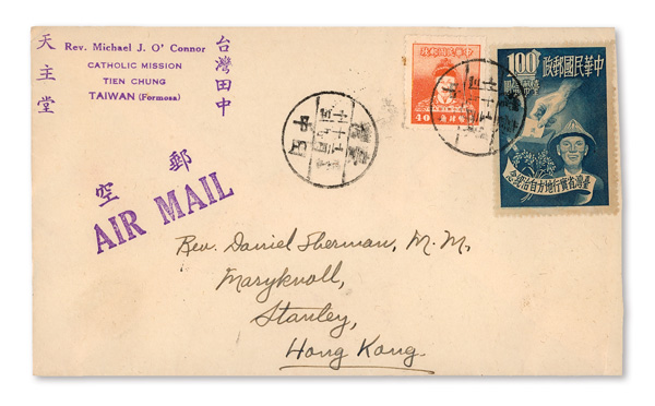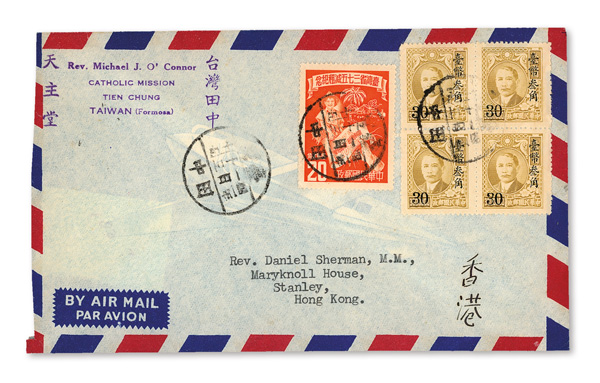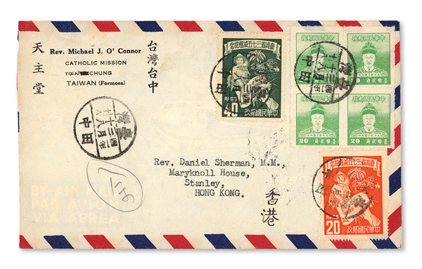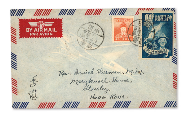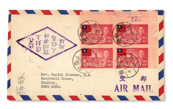 Rev. Daniel Sherman at Maryknoll House in Stanley, Hong Kong; most with mixed frankings including surcharged Sun Yat-sens, Koxinga, Election, Tax Reduction and Chiang Election issues; all individually sleeved and surprisingly clean and fresh;