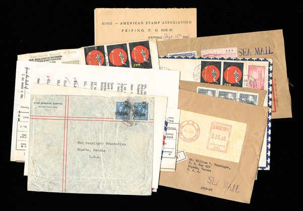 Kwangsi Province #12 pair on cover caught our eye as well; variously franked with Airmail, Registered and Printed Matter uses; several with original enclosures, one of which a 1948 Sino-American Stamp Association statement of account, where the CNC