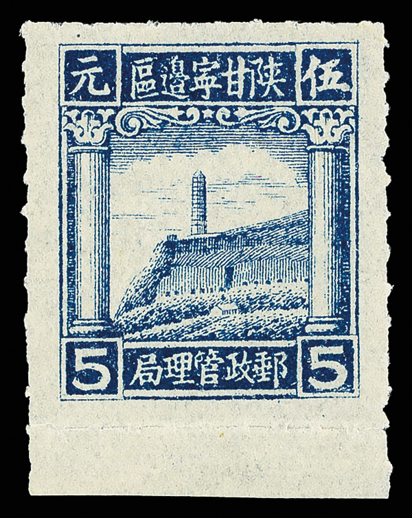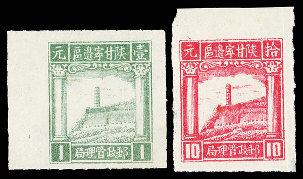 4348 ng image1946, Shaanxi-Gansu-Ningxia Border Area, Yenan Pagoda 1st printing, rouletted, $1 to $10 complete (Yang NW6-8. Scott 4L1a-4L3a), pristine trio, each with sheet margin, cleanly printed on brilliant white paper, without gum as issued, Very Fine. Scott $355 (HK$ 2,730). (Image1) (Image2) (Image3) (Image4) (All Images)