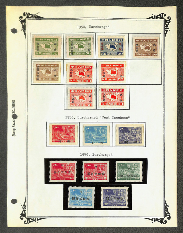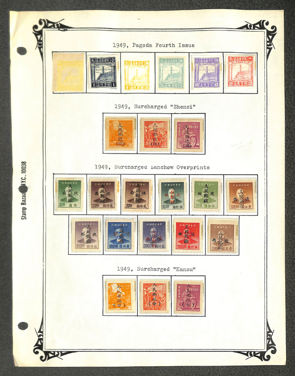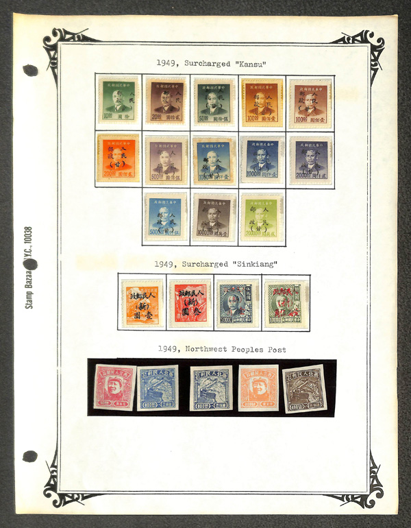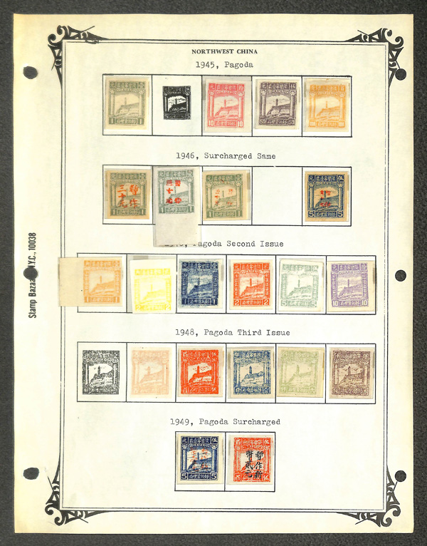 4347 imageNorth West China, Useful Mint Selection, 29 stamps in total on front and back of a stockpage, comprising Yenan Hill Pagoda issues, Chairman Mao, surcharges, even a group of Locals, some still on J. Millard Williams auction card; generally fresh and clean throughout with all appearing sound, Very Fine, fully imaged online. (Image1) (Image2) (Image3) (All Images)