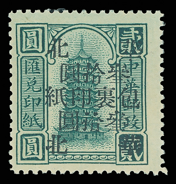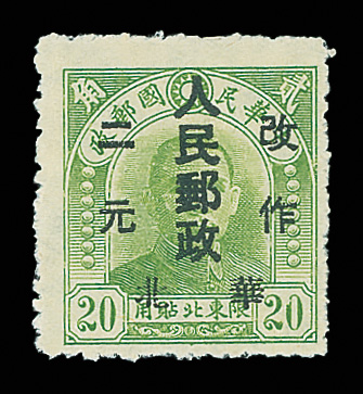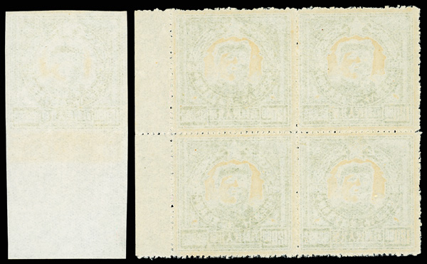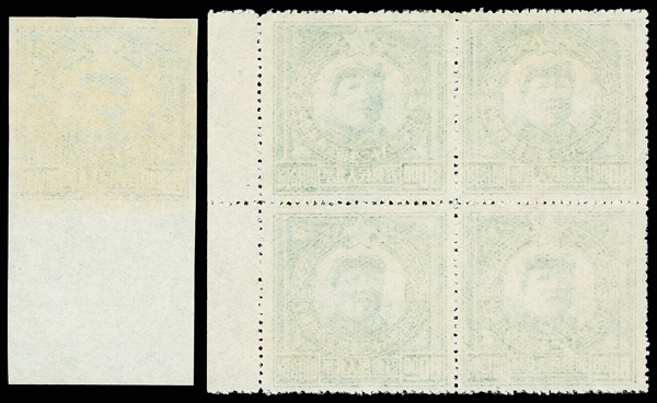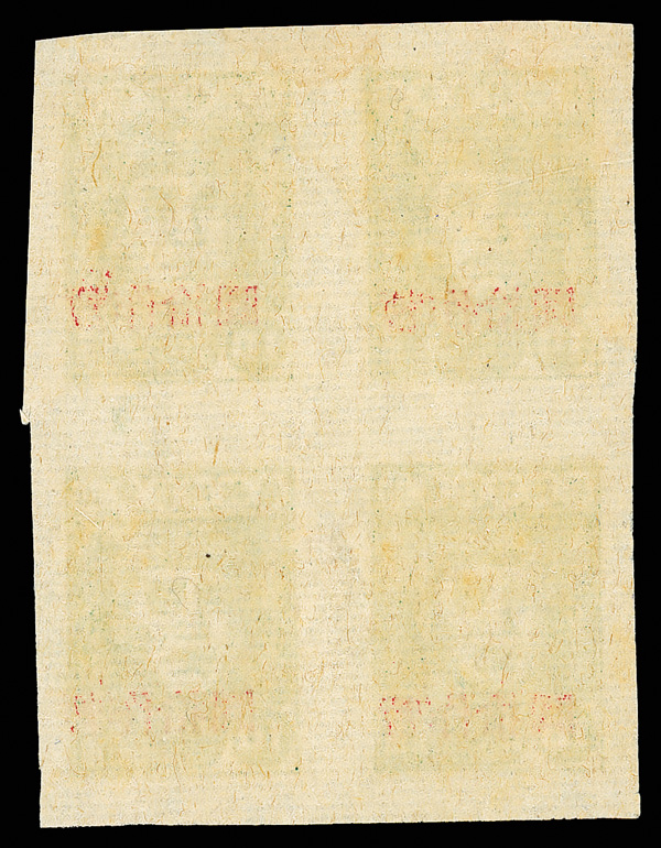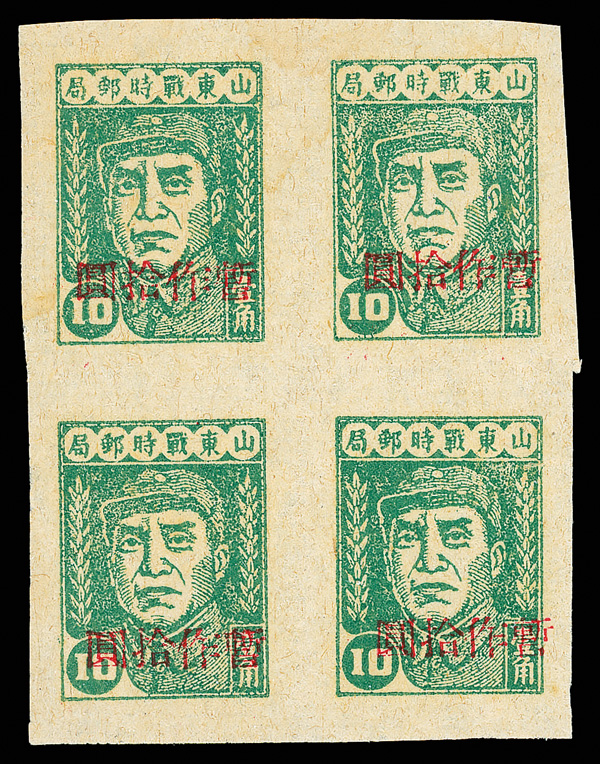 4344 image1945-49 "Temporary Used For" Surcharge on Chu-teh, $1 on 10c emerald green (red) (Yang EC68), block of 4, fresh color and wide margins, without gum as issued, Very Fine. (Image1) (Image2) (All Images)