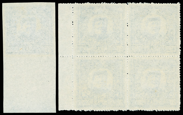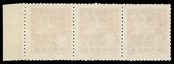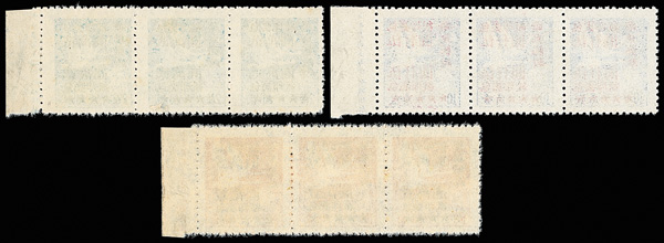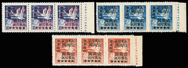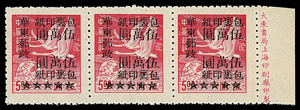 4345 ng imageParcel Post, 1949, "East China Posts" surcharges on Flying Geese, $5,000-$50,000 complete (Yang ECP7-10. Scott 5LQ23-5LQ26), in matched horizontal right margin imprint strips of three, each fresh and sound with bold color and solid perforations, without gum as issued, Very Fine. Scott $840 as singles (HK$ 6,460). (Image1) (Image2) (Image3) (Image4) (All Images)