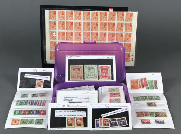 4334 imageChina (People's Republic) - Liberated Areas, Useful and Fresh Stock Compilation, many hundreds of stamps, mostly full sets, in glassines or on dealer cards, including most regions of this popular collecting area; many identified by either Scott or Yang number, with strength in East China issues; present are singles, pairs, blocks (including a couple imprints), imperforates, even a Revenue Stamp for Fourth Class Cigarettes (Paau #LA50) and a full sheet of 100 #5L77 (folded, but yielding four imprint blocks); fresh throughout with clean detail and generally fresh color, Fine to Very Fine with much better, fully imaged online. Shipping charges apply - weight 2.2 lbs. (PDF for this Lot) (PDF2 for this Lot) (Image1) (All Images)