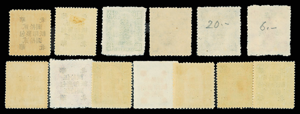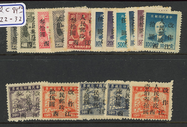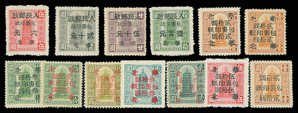 4342 og/ng imageParcel Post, 1949, Peking & Tientsin surcharges on Money Order stamps complete (Yang NCP6-9, NCP17-26. Scott 3LQ10-3LQ21), a complete set of the surcharges plus $20 on $1 perf 12½ (#3LQ14a) and $30 on $2 with red surcharge (#3LQ15a), some without gum, others o.g., fresh, Very Fine. Scott $425 (HK$ 3,270). (Image1) (Image2) (Image3) (Image4) (All Images)