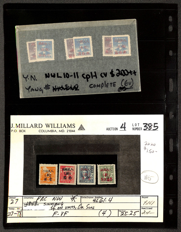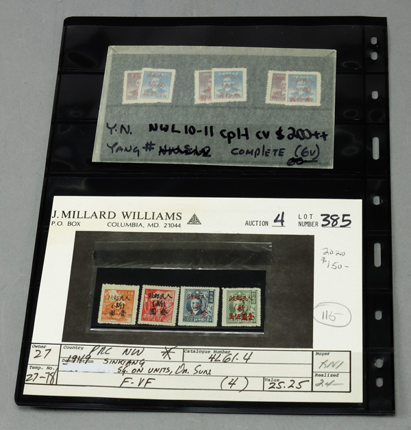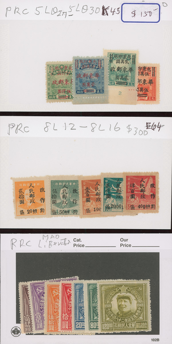 4336 imageChina (People's Republic) - Liberated Areas, Small Assortment with Better, useful selection of mint sets including #3L82-3L88, 5LQ27-5LQ30 (#5LQ29 a bottom plate number single), 6L17-6L32 (2), 8L12-8L16, and Yang NE240-245, all identified on dealer cards, Very Fine, catalogue value for Scott-listed items $777. (Image1) (Image2) (Image3) (All Images)