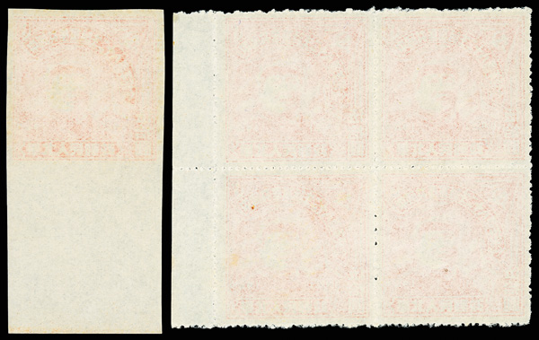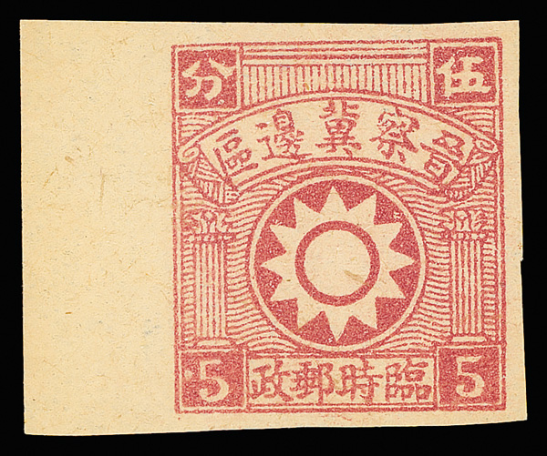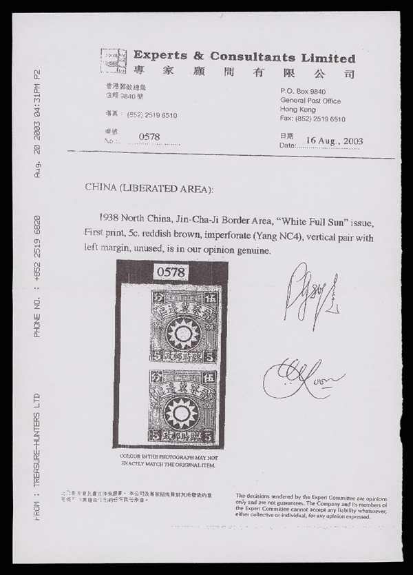 4339 ng image1938, Shanxi-Chahar-Hebei Border Area, White Full Sun of Nationalist China, 1st printing on brown paper, 5¢ reddish brown (Yang NC4), left margin single, fresh and sound with clean impression, without gum as issued, Very Fine, with photocopy of 2003 Experts & Consultants Ltd. certificate for pair, this the bottom stamp. (Image1) (Image2) (Image3) (All Images)