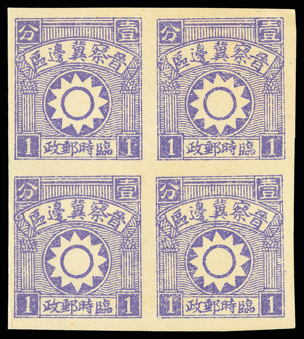 4338 ngbl image1938, Shanxi-Chahar-Hebei Border Area, White Full Sun of Nationalist China, 1st printing on brown paper, 1¢ dull purple (Yang NC3), block of 4, Post Office fresh with clean impression, sound and well centered, without gum as issued, Very Fine, a beauty. (Image1) (Image2) (All Images)